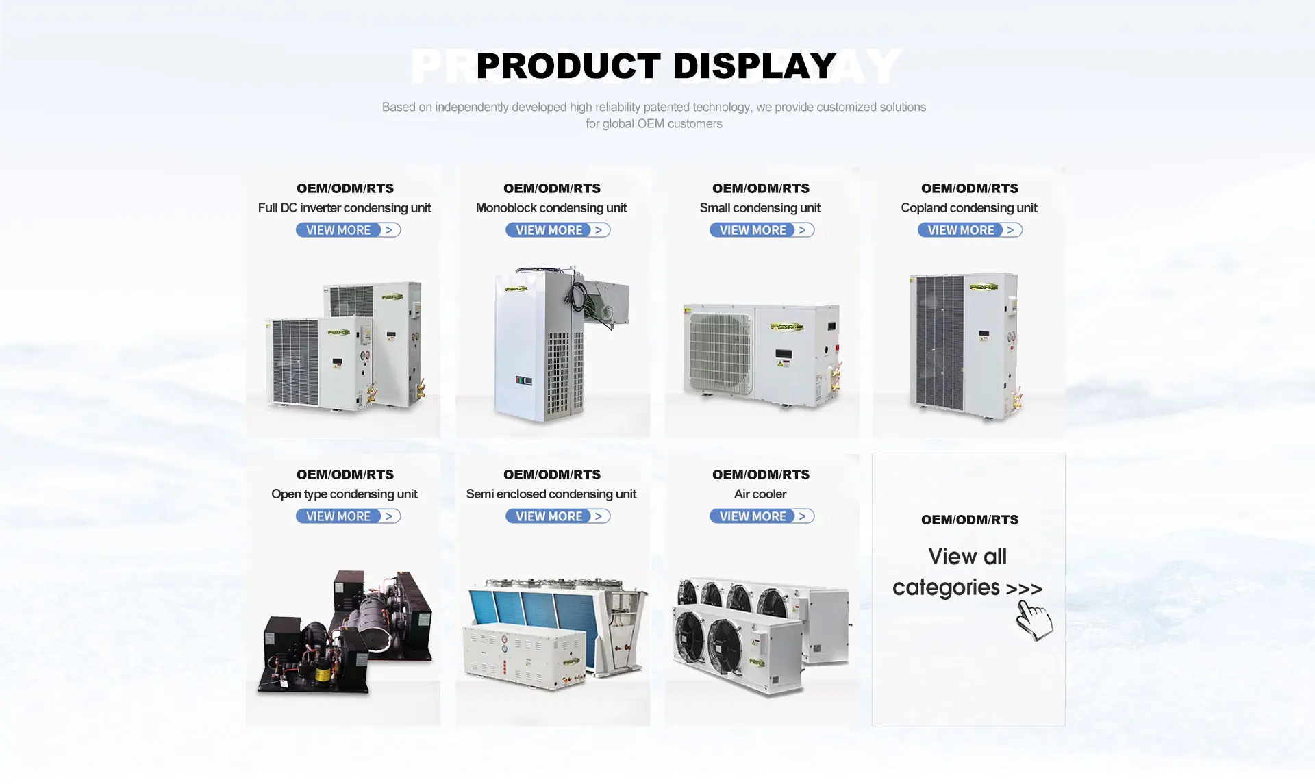 Sản Phẩm chính: Làm mát không khí, động cơ quạt ngưng tụ đơn vị, đầy đủ DC Inverter ngưng tụ đơn vị, năng lượng mặt trời-Powered container-tủ lạnh, mở loại ngưng tụ đơn vị